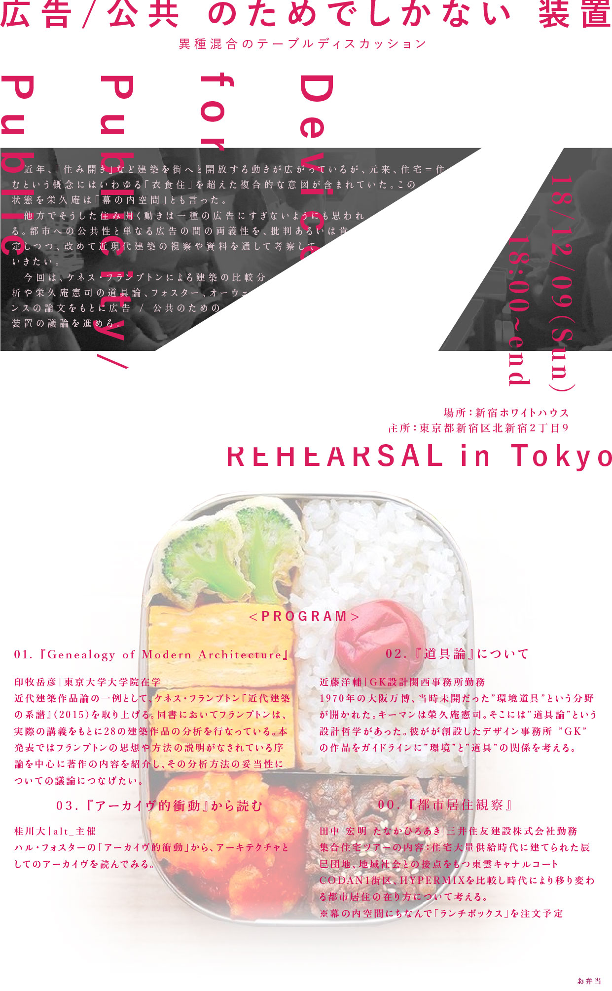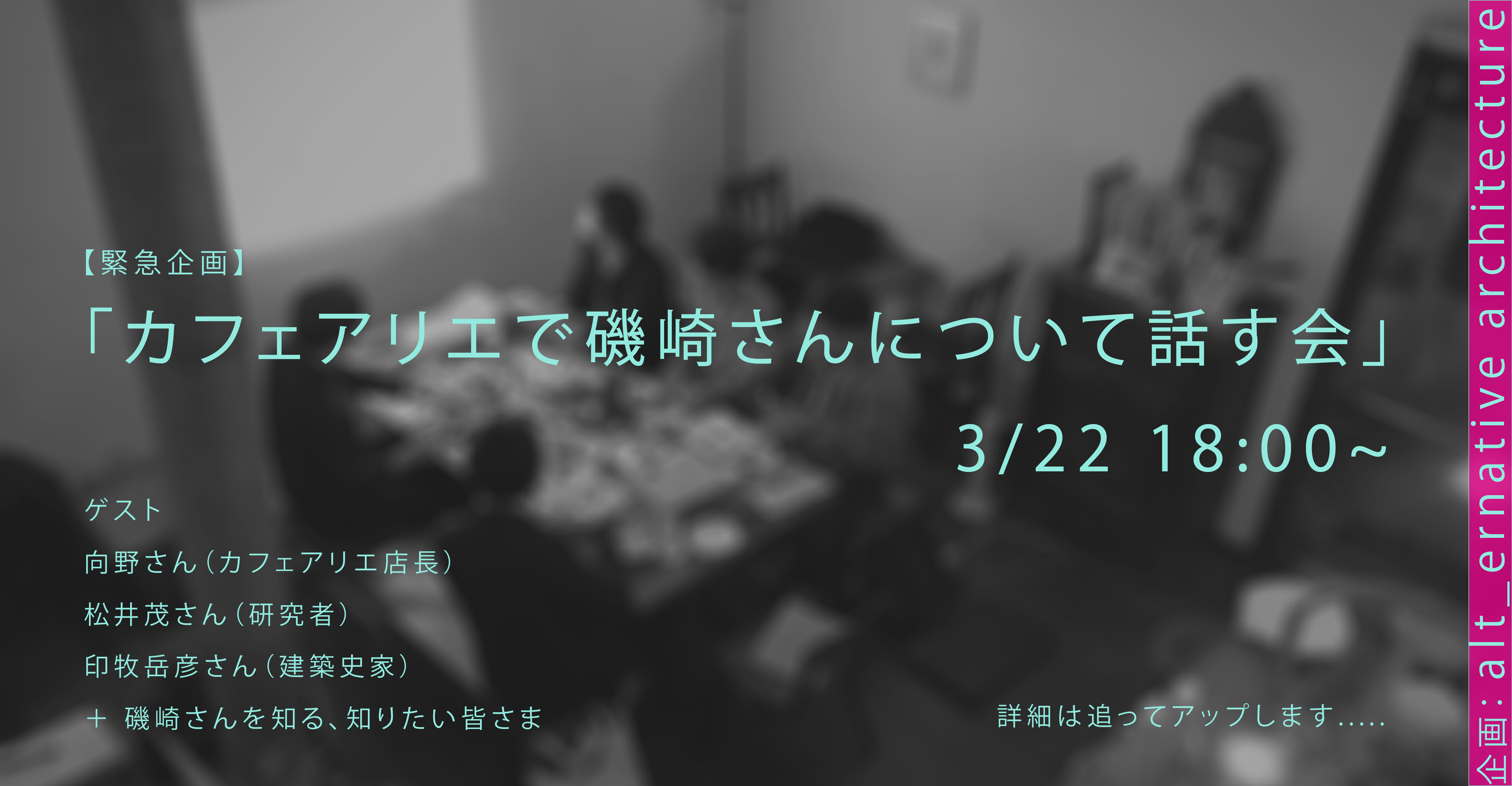 2016年から新宿ホワイトハウス(カフェアリエ)を拠点とさせてもらい、2018年まで中島亮二、印牧岳彦と主催した建築周縁の研究・勉強会。alternative greenhouseのプロジェクトから震災以後の建築、都市など様々な議論が発生した。カフェアリエが閉店してから名古屋に拠点を移し、より広い分野との協働を探る活動を模索している。